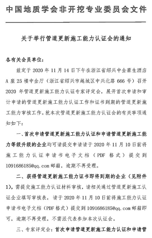 鑒于疫情的不確定性,2020年CSTT管道更新施工能力認證專家評定會(施工能力審核)計劃就召開這一次。請有需要的單位,詳細閱讀本通知,并于2020年11月10日前提交審核材料,逾期將不再受理。